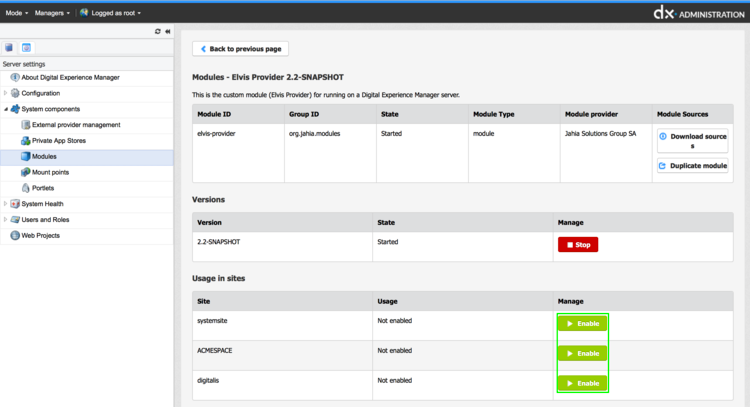 Deploy the module through the Module Administration user interface, or copy the jar file in the digital-factory-data/modules folder. Once deployed, the Elvis connector needs to be enabled for one or more websites created and managed with Jahia. Click on the "Detail" button to access the configuration panel of the module.