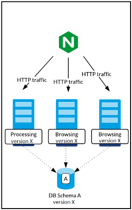 Consider the following environment: a cluster of 3 nodes in the version X behind a load balancer (represented by the