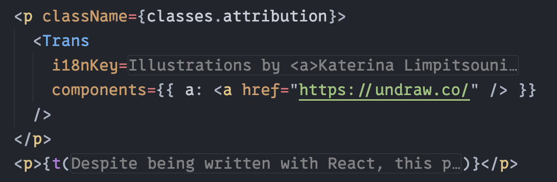When creating views and templates, you may want to include static text such as <a href="...">Read more</a> links or labels like Written by {{author}}. For all user-facing translations, we use the i18next and react-i18next libraries. This guide covers the basics, but you can refer to the official documentation for more details.
