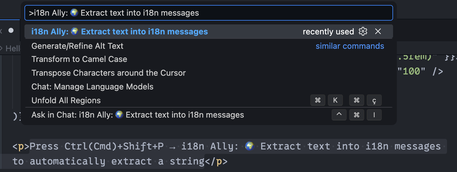 It also provides a VS Code command to extract hardcoded strings into translation files: