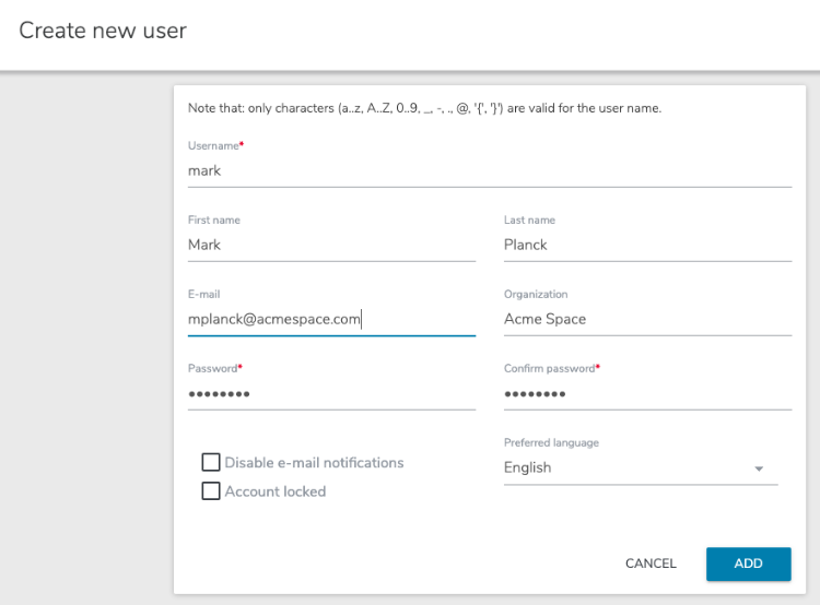 - In the Create new user page, enter properties for the new user.