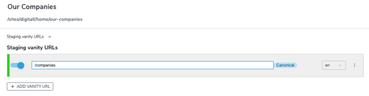 When saving the value, if the vanity URL doesn't start with a slash (/), a slash is automatically added at the beginning. The vanity URL can only contain letters, digits, dots (.), dashes (-) and no consecutive slashes. By default, the language selected for the vanity is the one selected in Content Editor, but it's possible to change it if needed.