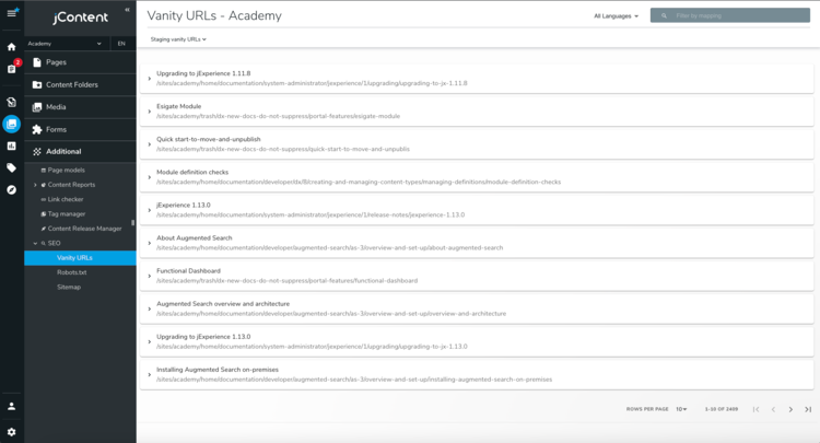 Vanity URLs dashboard accessed from jContent>Additional>Vanity URLs