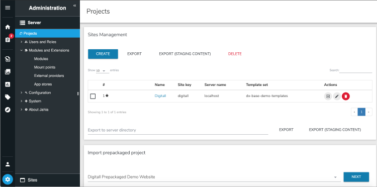 Jahia differentiates server administration from site administration. The server administration is about the high level management of the platform, modules, or definition of roles for instance, while the site administration focuses on managing a single project.