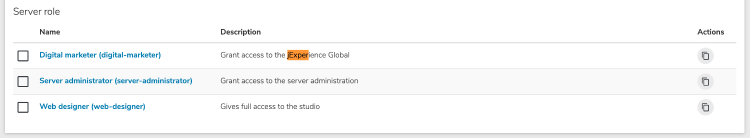 Permissions to access jExperience global features must be associated with server roles. Server roles are found at the bottom of the Roles and permissions page.
