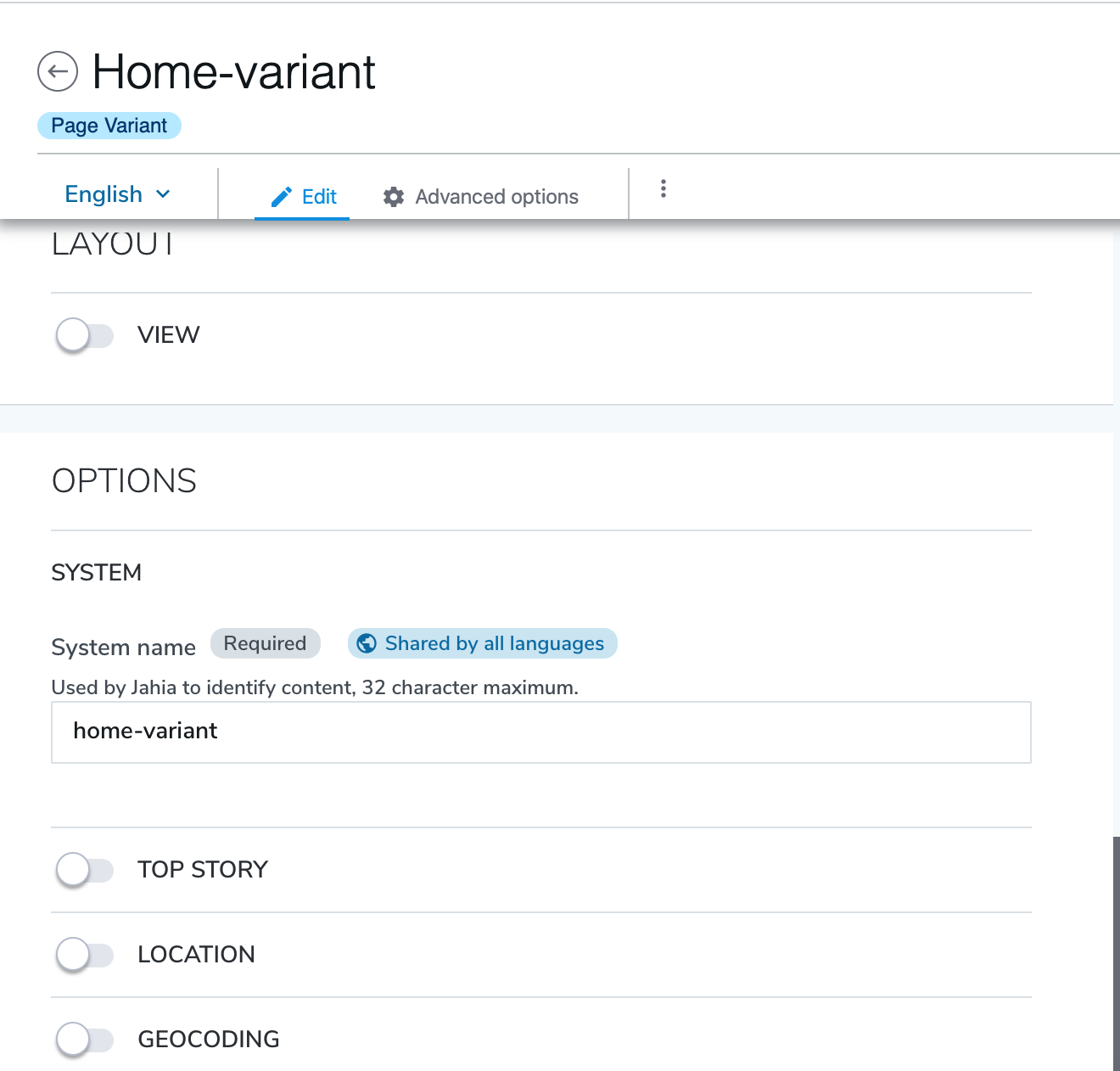 - To specify how the pages display to users, you must edit the first page variant. Select Edit from the Page Options menu at the top right of the page.