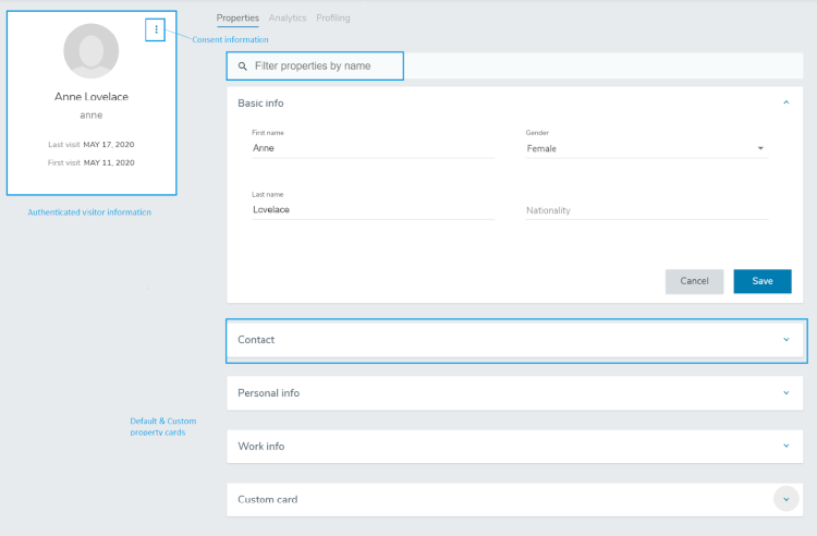 The Visitor profile pane gives you an overview of all the property values you have available for a specific visitor. Properties are organized as cards, you can expand and collapse to see the properties that are part of each card grouping. Some properties are cards are created for you by default, you can add custom cards and properties.