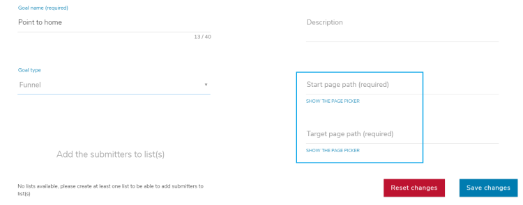- Use the page picker to set the start page and end page of your funnel. Use the page you just added interests to as the start page and set another page such as Home as the target page.