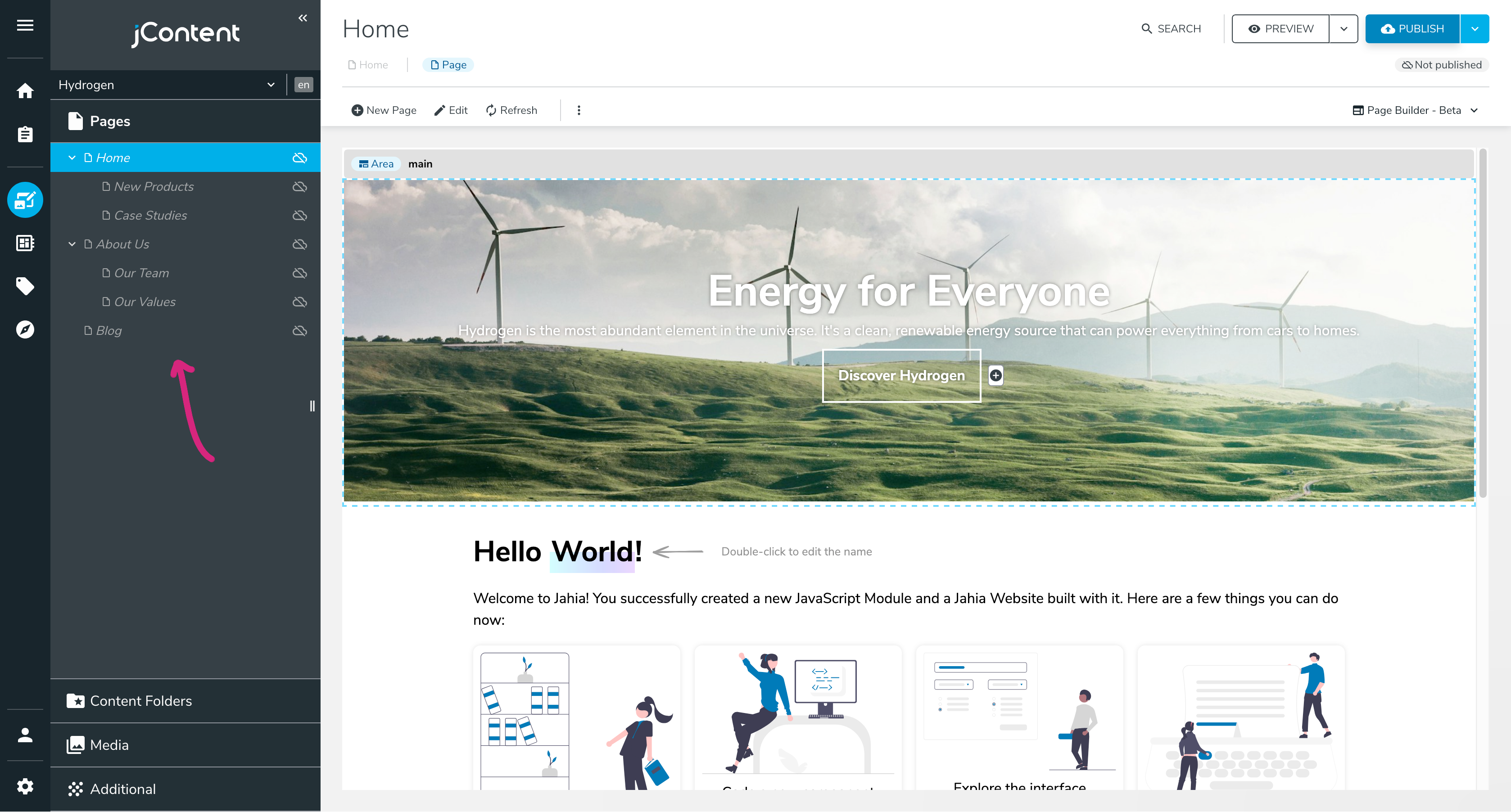Jahia supports creating pages in a tree structure. Each page can have child pages, forming a hierarchy. Create a few nested pages under the Home and About Us pages to create a tree structure. You can use the Page Composer sidebar to create and move pages around.