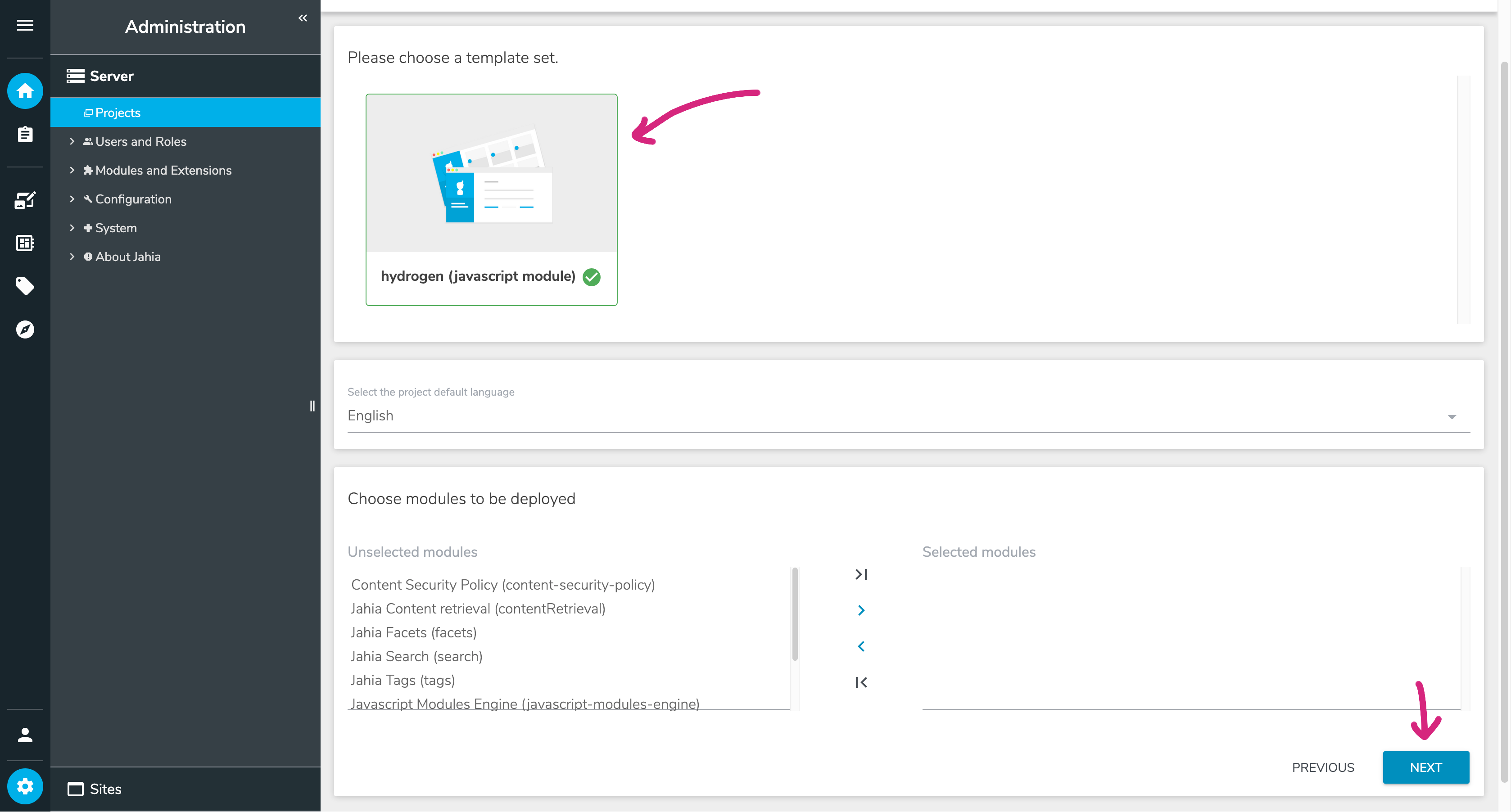 Now that your template set (that's how we call a module that provides page templates) was pushed by the yarn dev command, you can create a new website with it: