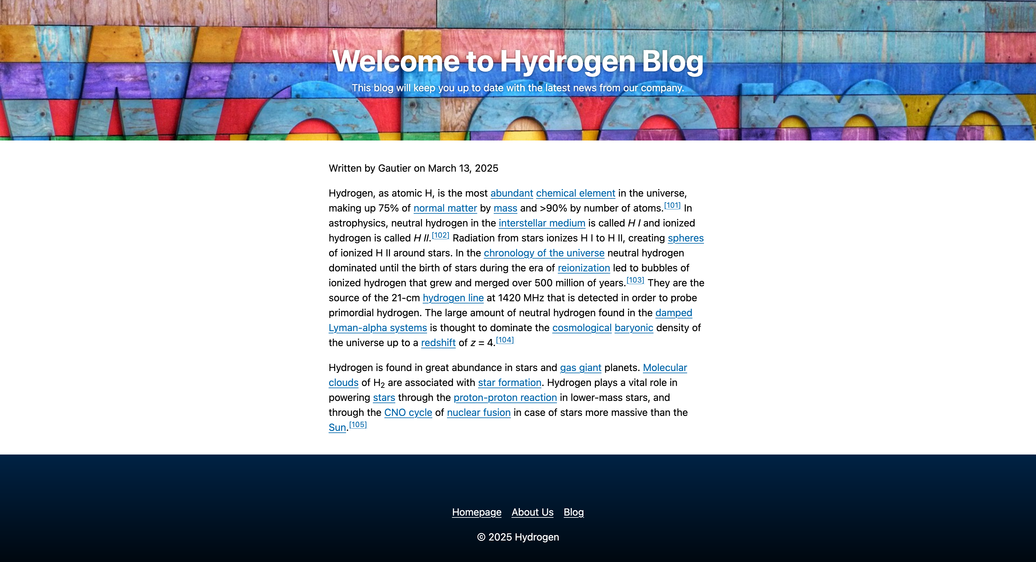 <AbsoluteArea name="footer" parent={renderContext.getSite()} nodeType="hydrogen:footer" />in the view to render the footer. This will display the footer component at the bottom of all blog posts.